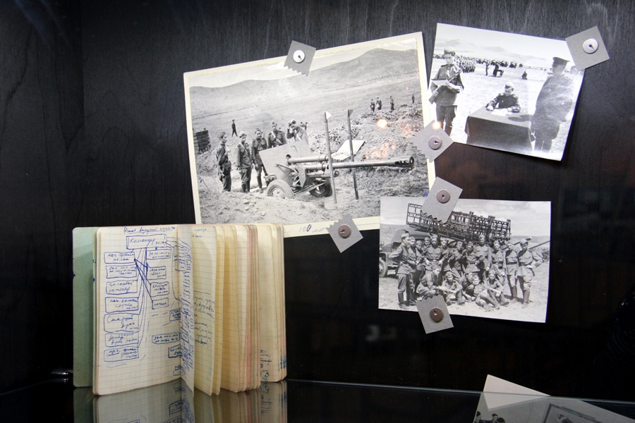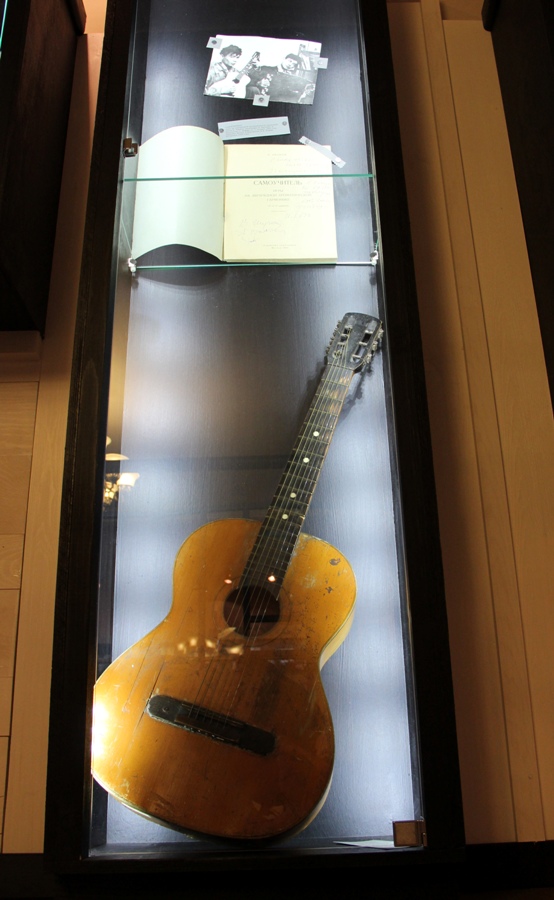 Основная часть вещей – подлинники. Почти ко всем прикасалась рука Вампилова. Есть коллекция пластинок с классической музыкой, что они с однокурсниками собирали, отслеживая и покупая на сэкономленные со стипендии деньги. Моцарт, Бах, Чайковский, Глинка, Бетховен. Керамическая кружка, из которой он любил пить чай в гостях у своего друга Владимира Жемчужникова. Гитары. Коробочка для рыболовных принадлежностей (он ведь слыл заядлым рыбаком). Есть жилет, который он надевал на предпремьерную репетицию «Старшего сына» в ноябре 1969 года. А в белой кепке, что висит рядом с жилеткой, по словам его жены Ольги Михайловны, он был в день трагической гибели. Одну из частей экспозиции занимает «кабинет» Александра Вампилова: стол, за которым писалась «Утиная охота», пишущая машинка и набранная пьеса на жёлтом, уже ветхом от времени листке, настольная лампа, фотография жены и дочки Лены, прикреплённая над рабочим местом…