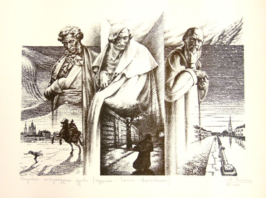 «Мировое литературное древо (Русская литература XIX века) А.Пушкин - Н.Гоголь - Ф.Достоевский». Литография.