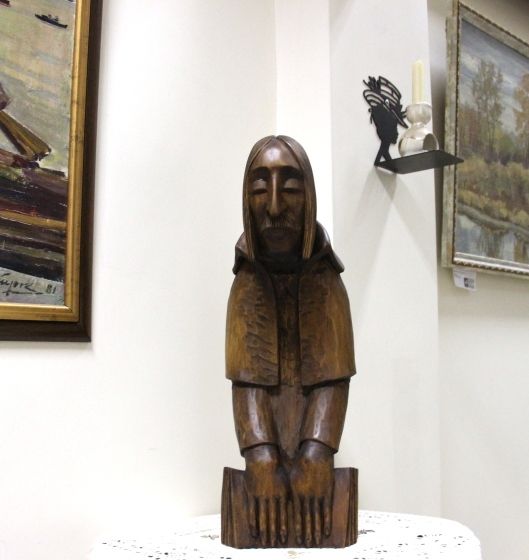 Скульптура «Гоголь. Муки творчества». Автор: Лев Сериков. Скульптура выполнена мастером из сибирского кедра, подарена Центру автором в 2019 году. По словам Льва Ивановича, том, который сжимает в руках великий классик – второй том «Мёртвых душ», и, во время создания этой скульптуры он пытался понять, о чём думал Николай Васильевич перед тем, как принял своё роковое решение – сжечь рукопись. Он, уже сложившийся и признанный автор, большой литератор стоит под гнётом мыслей о творческой неудаче, он смиряется, признаёт для себя, что эта книга не получилась, хотя ей было отдано столько сил. Скульптура передаёт весь спектр эмоций гения, воистину, муки творчества.