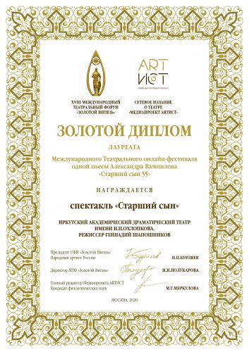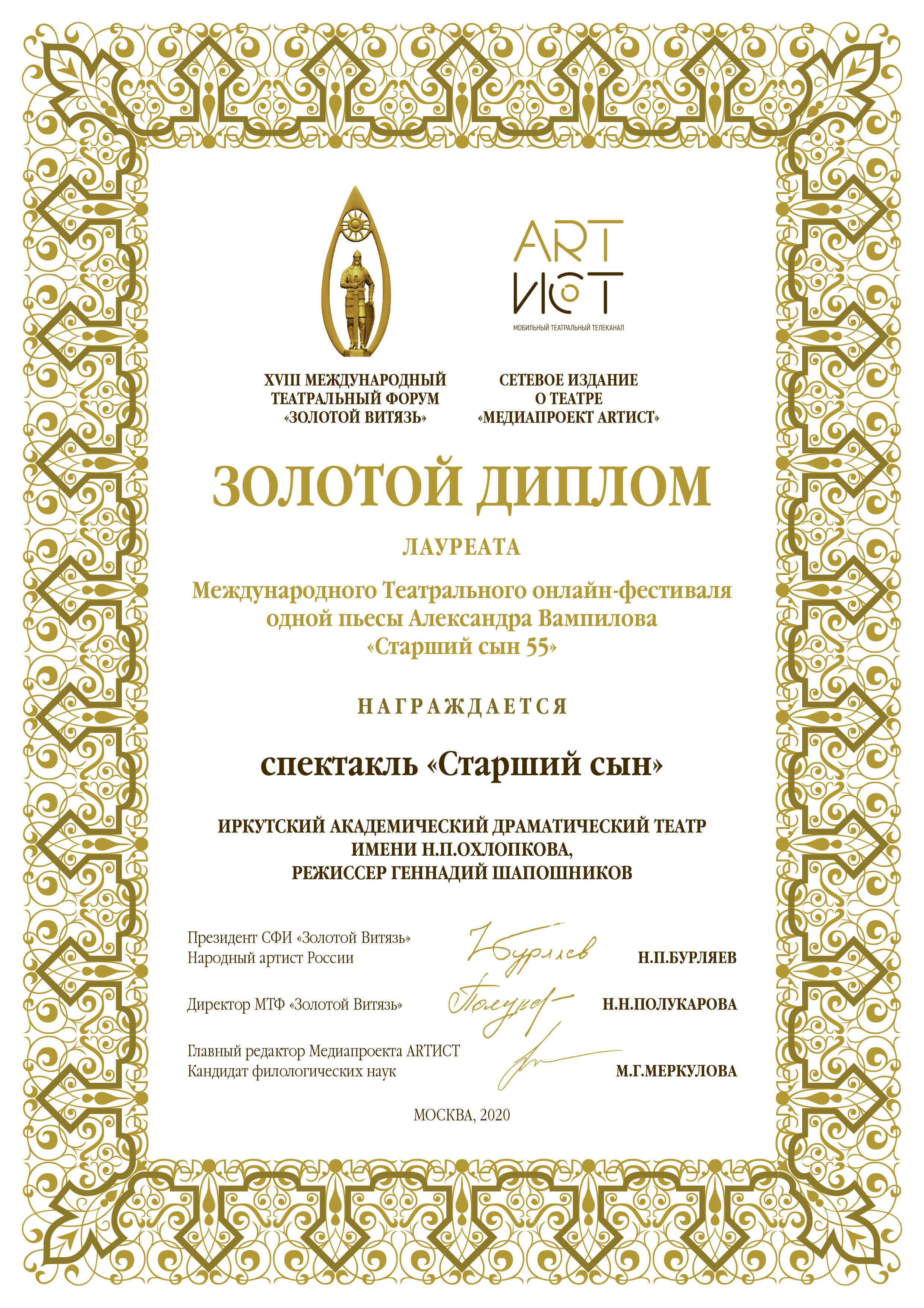 Золотым дипломом Международного онлайн-фестиваля одной пьесы «Старший сын -55» награждён спектакль Иркутского академического драматического театра им. Н.П. Охлопкова «Старший сын» в постановке Геннадия Шапошникова.