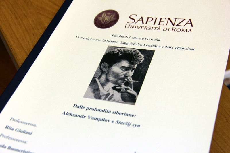 Наш итальянский друг Валентина Каррано из римского университета Ла Сапьенца, о которой мы уже писали на сайте, завершила свою работу по творчеству Александра Вампилова. Сегодня труд пришёл к нам на почту. Называется он «Dalle profondita siberiane: Aleksandr Vampilov e Starsij syn», что переводится как «Из глубины Сибири: Александр Вампилов и "Старший сын"». В предисловии автор благодарит тех, кто помогал ей в освоении творческого наследия драматурга в Иркутске, в том числе ТЮЗ им.А.Вампилова и актёра Владимира Безродных, который подарил Валентине свой графический портрет Александра Валентиновича, и сотрудников Центра А.Вампилова.
