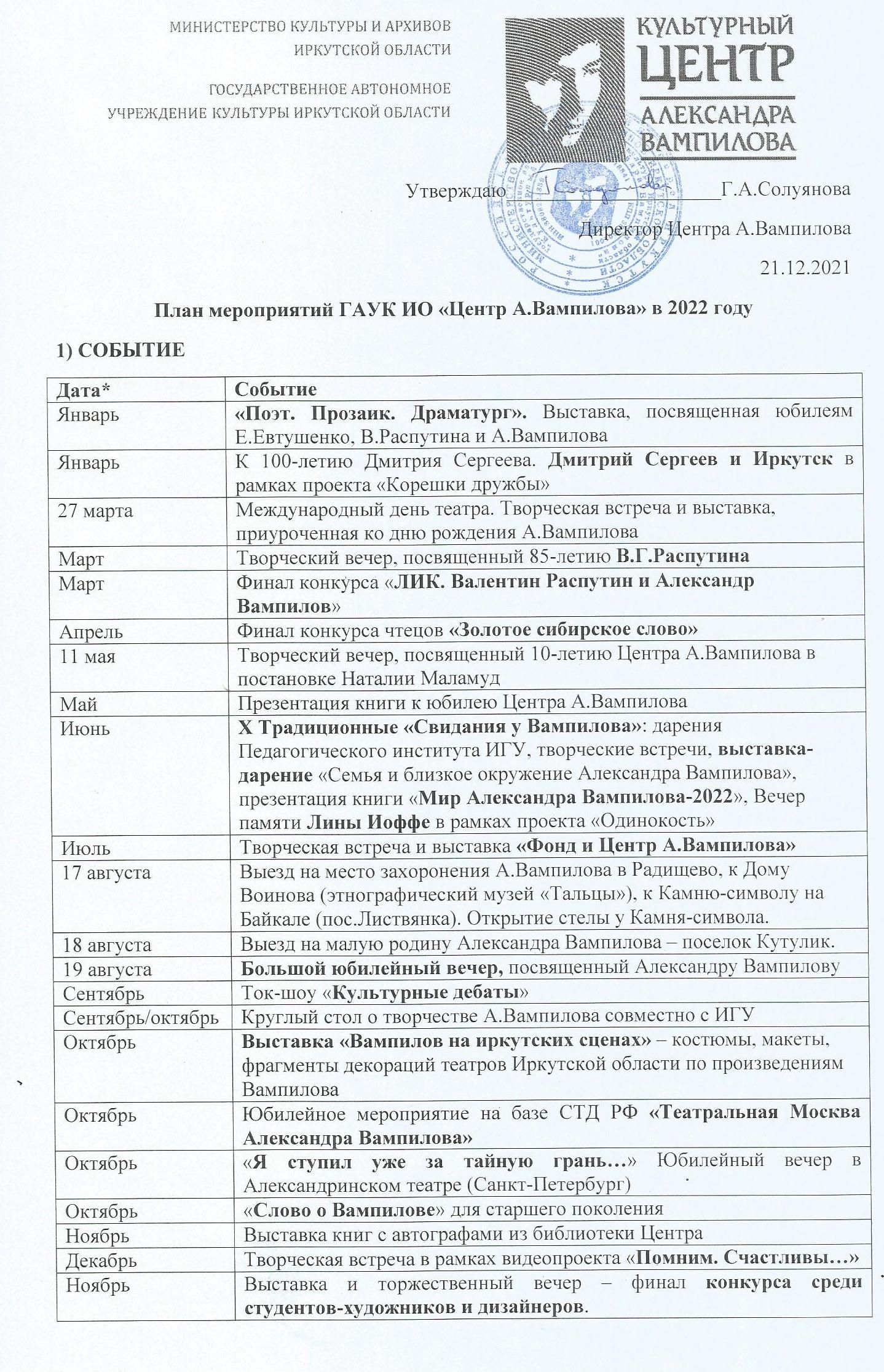 Фотоотчет Анатолия Бызова. Приветствуем в новом году! Центр А.Вампилова открыт и принимает посетителей после новогодних каникул. В 2022 году Дом драматурга готовит большое количество событий, посвященных 85-летию со дня рождения Александра Вампилова. Кульминация торжественных мероприятий придется на 17-19 августа, когда состоятся традиционные юбилейные Вампиловские дни. Помимо этого, в наступившем году выйдет издание, посвященное 10-летию Центра А.Вампилова, будет реализован документальный видеопроект «Помним. Счастливы…», мы проведем четыре конкурса для молодежи, объявим акции и откроем несколько выставок. Осенью Центр А.Вампилова организует юбилейные вечера в Москве и Санкт-Петербурге. Публикуем таблицу мероприятий – из нее вы узнаете о наших планах на год.