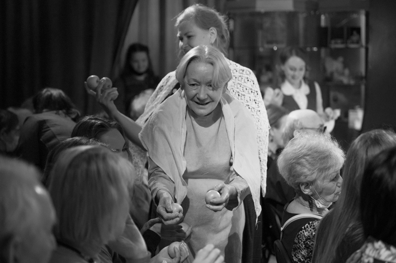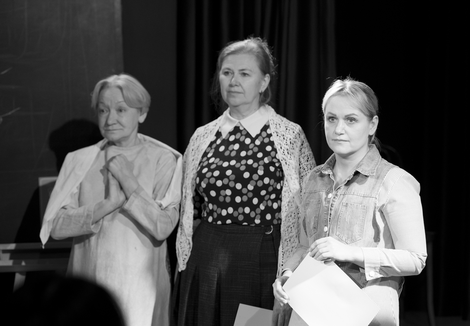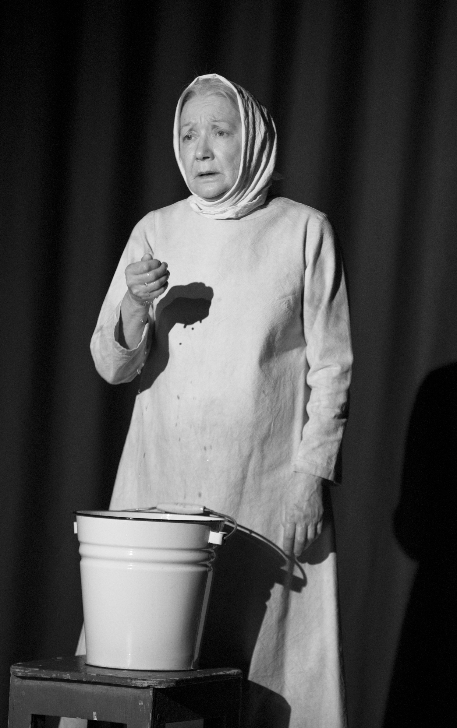 Завершающим отрывком вечера стал монолог из повести «Прощание с Матёрой» в щемящем исполнении актрисы ТЮЗа им. А.Вампилова Людмилы Попковой. На затемнённой сцене она воплощала образ Дарьи – одной из центральных распутинских героинь – мудрой старухи, которая всё помнит и всё понимает. Скоро её родная Матёра скроется под водами Ангары, и Дарья говорит с Богом о прошлом и о настоящем, о том, что такое Человек и в чём смысл его жизни. И вода плещется вокруг неё, и слёзы блестят в её больших знающих глазах.