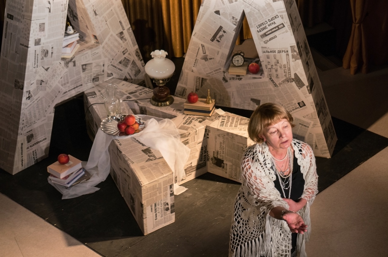 Декорации спектакля довольно условны. Самые заметные детали реквизита это три буквы «ААА», обернутые печатными текстами и фрагменты литературного, художественного интерьера: стопки книг, мольберт, красные яблоки. Такой фрагментарный «подвал памяти» делает пространство сцены абстрактным и концентрирует внимание на главной героине. Как нам видится, по замыслу авторов, условность окружения должна подчеркнуть вес звучащего слова, чтобы язык, образная речь стали главными проводниками в мир воспоминания.
