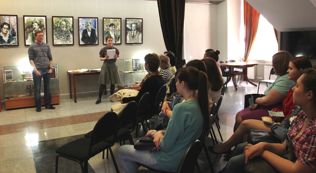 Филологи ИГЛУ. Центр Вампилова (2) Прежде традиционного «Слова о Вампилове» гостей познакомили с прибайкальскими драматургами, чьи портреты в серии «Драматурги…из Прибайкалья» создал  художник Юрий Квасов. Конечно, имена Владимира Гуркина и Александра Вампилова были известны всем слушателям, но вот с Беллой Левантовской, Михаилом Ворфоломеевым, Игнатием Дворецким и Павлом Маляревским многие встретились впервые. Далее после насыщенного рассказа о жизни и творчестве нашего героя гости осмотрели музейную экспозицию «На антресолях» и спустились в Картинную галерею и Библиотеку.