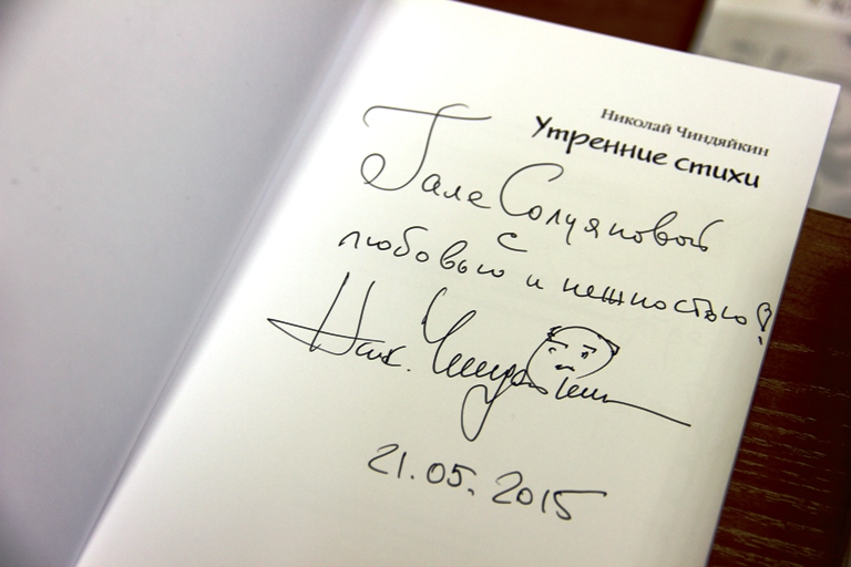 Библиотека пополнилась и другими великолепными изданиями, которые привезла из поездки в Москву и Санкт-Петербург директор Галина Солуянова. Среди них – поэтическая книга «Утренние стихи»  с автографом народного артиста РФ Николая Чиндяйкина (Москва, 2014) и новая пьеса Людмилы Разумовской «Хэллоуин для россиянцев» в сборнике комедий петербургских драматургов «Одинокий мужчина с пишущей машинкой» (Санкт-Петербург, 2014).