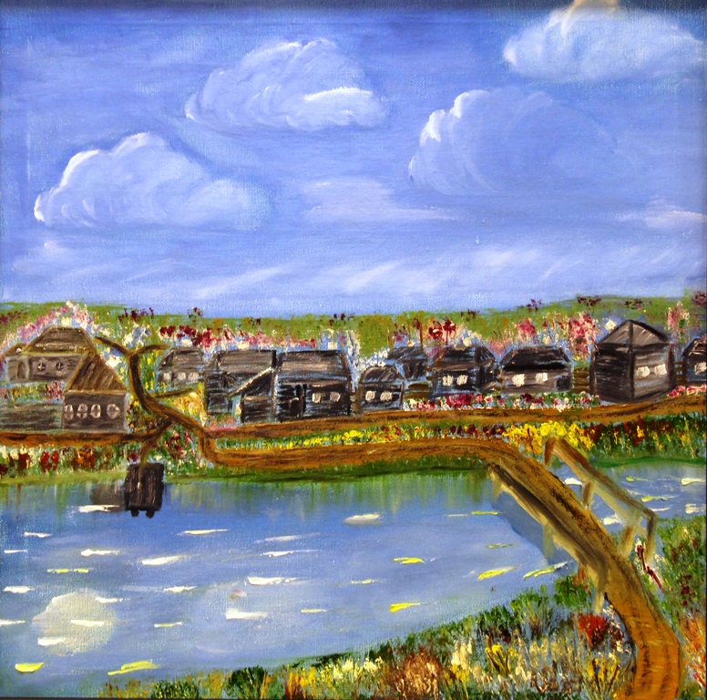 Фотоотчет Анатолия Бызова. Недавно Центр А.Вампилова получил посылку с мадридским адресом в строке отправителя. Она пришла от Валентины Войтович, писательницы, художницы и землячки Александра Вампилова. Две картины были определены в фонд Картинной галереи, книга на украинском языке - в библиотеку, ну а гостинец в виде испанского кофе - в гостиную комнату. Друзья Вампилова живут по всему миру, и хорошо, что очаг его духа горит здесь, в Иркутске. Валентина Войтович Память происхождения. "Но, отдаляясь, не чаще ли я стал возвращаться сюда в своих мыслях?" Вампилов А. В. Прекрасная наивная неискушенность Кутулика в начале 20 века позволила Вампилову Александру Валентиновичу найти вдохновение в большую литературу и куда он хотел возвращаться и возвращаться... Именно этот Кутулик с его кривыми переулками и низкими домами, прекрасными полевыми цветами поднял у него творческие волнения и помог реализовать их в литературе. У Кутулика в 20 веке был тот же путь по переулку Косому на железнодорожный вокзал, который проходил через мост-дамбу речки Кутулик, но все это уже в истории, в памяти тех кто жил в это время в Кутулике. Как будто акварельный дождь поменял его... Что-то оставил, а что-то и стер… навсегда. Но моя память оставила, крепко запомнила это место нашего происхождения, стертое дождем времени... И этот уголок старинного Кутулика, это место я постаралась переложить в картину… Все нам тогда казалось современным и школа, и кинотеатр, и природа была самая красивая для нас... Она была для нас и с нами... В начале лета цветы росли все сразу, разных раскрасок... Лето было вместо детских картинок-раскрасок... А иван-чай выростал в наш рост, создавая плотные заросли. Некоторые даже были выше домов. В них мы играли в прятки... Коровы могли все это съесть, но через пару дней все опять благоухало и пахло летом... А речка Кутулик, которая протекала через дамбу-мост, выходила уже через него серебряным ручьем, окруженный с двух сторон магическим зеленым лугом с солнечными цветами-жарками . Кутуликские акации в палисадниках... Тянуло сюда Вампилова потому что это было его и он видел то, что хотел видеть, то, что искал в Кутулике. Он говорил правду о нем и любил его. На моей картине "Летний Кутулик в 20 веке" изображен Косой переулок с речкой и мостом в те годы. Сколько же по этому мосту прошло людей... Шли по нему на железнодорожный вокзал, на Цыганскую гору, в сторону райпотребсоюза... и зимой и летом... Сколько историй и тайн хранит этот мост... Отдавая эхом в наше время. Косой переулок знали все в Кутулике. Начинался он с детских яслей и заканчивался маленьким закрытым базарчиком. Переулок был окружен глубокими оврагами с обеих сторон дороги, которая вела на мост-дамбу и с другой стороны на улицу Советская. C одной стороны переулка, нечетной, находились ясли, три дома и базарчик. С другой стороны, четной, было тоже три дома... Из них один был двухэтажный. Он излучал всегда таинство... Это был добротный дом. По этому переулку в одно и тоже время шли коровы на пастбище и возвращались в свое время в свои дома. Оставив тоже свое эхо времени в этом переулке. Эхо луга, эхо колодца на пригорке, эхо, эхо, эхо времени... А летом в 5 часов вечера солнце заливало все золотой жидкостью, украшая все, что существовало... Переулок Косой начинал играть солнечными лучами в пыли оврагов, на стеклах окон, 