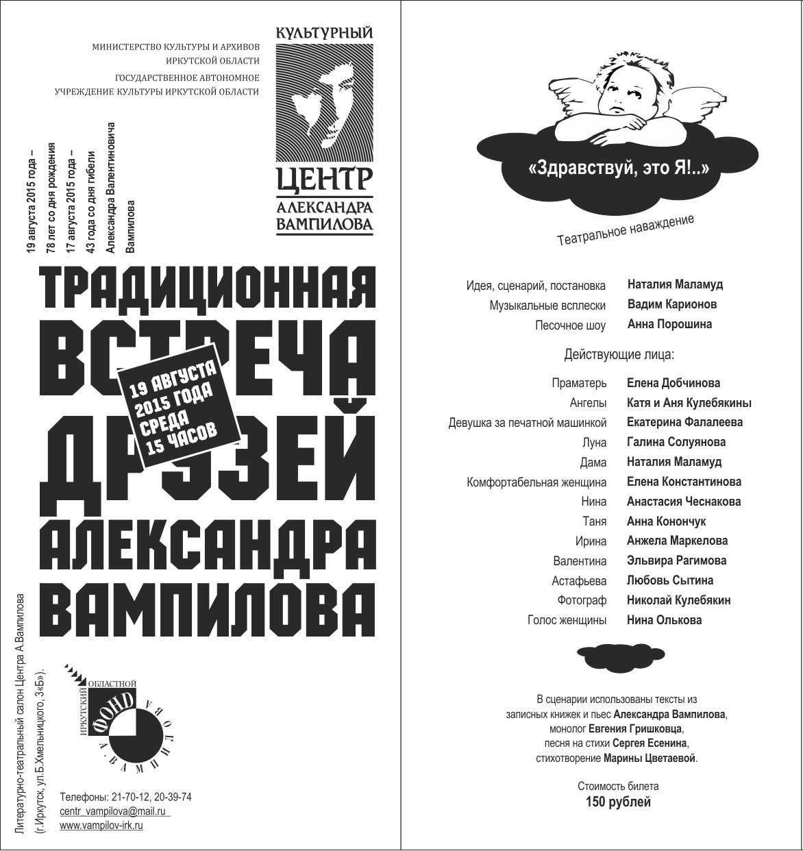 Фотоотчет Анатолия Бызова. В день рождения Вампилова состоится премьера театральной постановки по мотивам его пьес Приближается главный праздник года для всех почитателей вампиловского творчества – 19 августа, день рождения драматурга. Как всегда, мы подготовили Традиционную встречу друзей Александра Вампилова и рады будем приветствовать вас! 78-летие со дня рождения Александра Вампилова отметится театрализованным действием, которое создала актриса ТЮЗа им.А.Вампилова Наталия Маламуд. «Здравствуй, это Я!..» - постановка с подзаголовком «театральное наваждение» насыщена женскими образами из вампиловских произведений, она атмосферна, загадочна и даже сюрреалистична. В зарисовке принимают участие актрисы ТЮЗа Елена Константинова, Анастасия Чеснакова, Анна Конончук, Анжела Маркелова, Эльвира Рагимова, Любовь Сытина, Нина Олькова, а также актёр Николай Кулебякин, музыкальное сопровождение Вадима Карионова. Действие на сцене украсит песочное шоу Анны Порошиной. 19 августа, в среду, в 15 часов в Доме на Богдана Хмельницкого, 3 Б. Стоимость билета – 150 рублей.