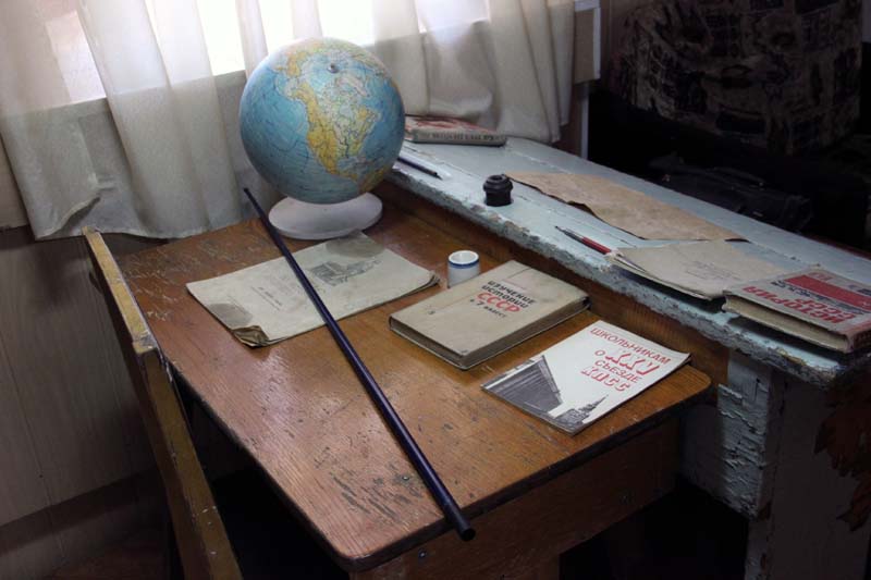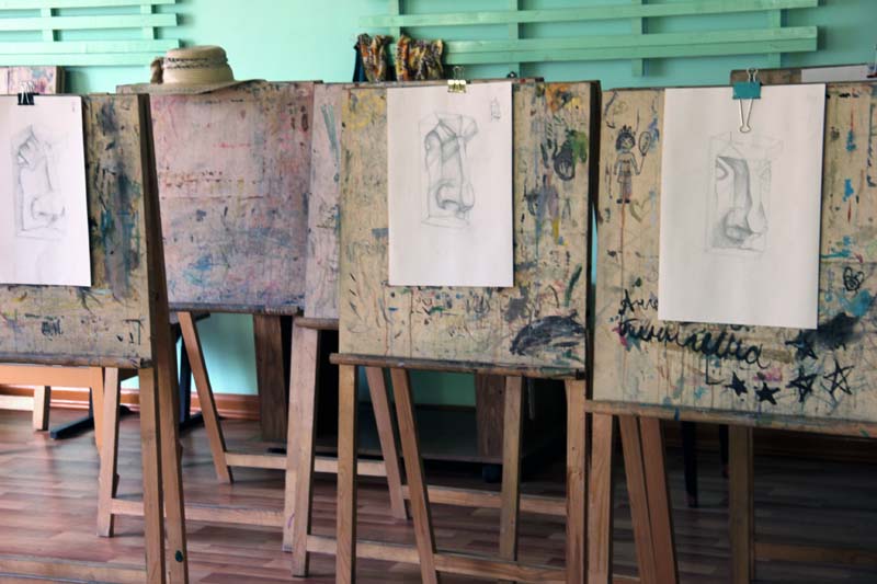 Недалеко от краеведческого музея располагается школа искусств, пустая на тот момент, что мы пришли. В классе рисования рядом с мольбертами загадочно стояли на полу пара десятков детских рюкзаков, вызывая вопрос об их невидимых обладателях. Мы решили, что они, наверное, на пленере. Заглянули и в другие классы, в общем, вели себя крайне любопытно в отсутствии хозяев. Зашли в актовый зал. На небольшой сцене под буквами «Лейся, песня, рекой» (или что-то в этом роде), стояли всевозможные инструменты: электрогитары, барабанная установка, электронное фортепиано, и всё такое новенькое, блестящее. ![]()