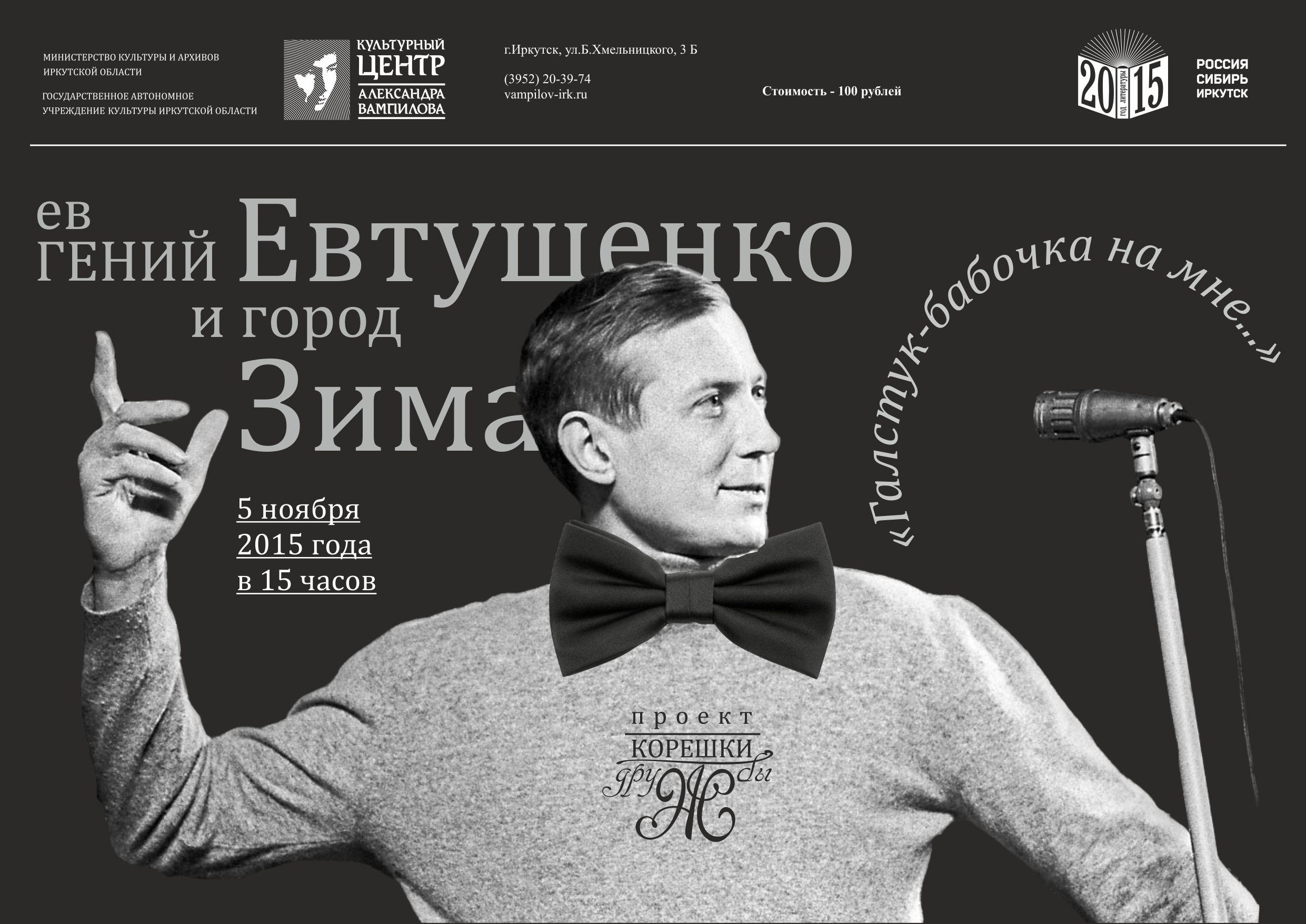 «Галстук-бабочка на мне...» - так называется встреча. Студенты Иркутского театрального училища исполнят любимые стихотворения автора, а гости из Зимы привезут выставку детских работ, посвящённых поэту, книги с автографами Евтушенко и фотографии, а также расскажут о городе.