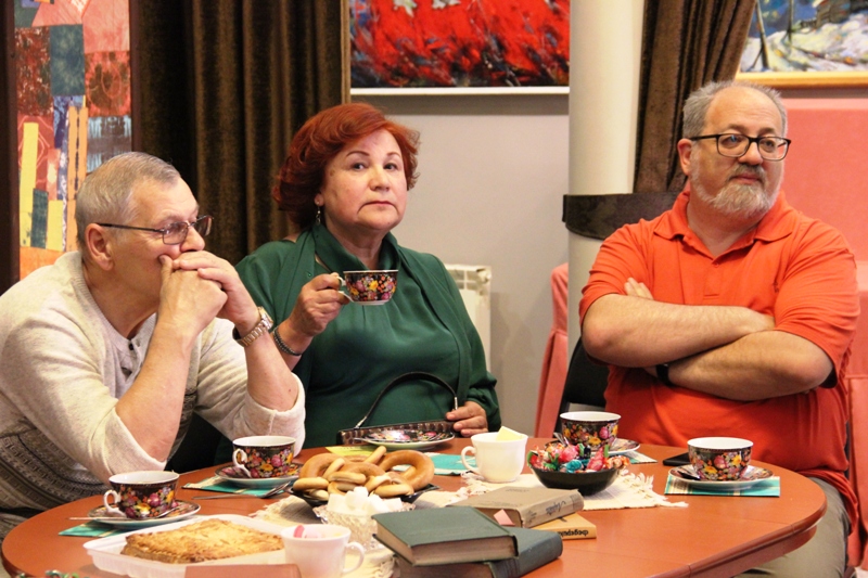 Фотоотчет Анатолия Бызова. Сегодня в библиотеке им.Молчанова-Сибирского в 15 часов будет представлен третий номер 2015 года альманаха «Сибирь», где на 246 странице читатель сможет обнаружить заметку Ивана Тронина о Литературном чаепитии с иркутскими авторами, чьи книги с автографами находятся в библиотеке Центра. Напомним, что тематическое чаепитие за столом с замечательными поэтами, прозаиками и публицистами проходило этим летом в рамках «Свиданий у Вампилова». Хороший повод на минуточку окунуться в летние воспоминания. Литературное чаепитие Данная цитата из книги бразильского писателя Пауло Коэльо применима и к Центру Александра Вампилова, в котором 25 мая прошёл завершающий день в цикле традиционных, уже IV «Свиданий у Вампилова-2015». И стали они традиционными оттого, что перешагнули порог единичного События. За накрытым по-домашнему столом (горячий чай, сушки, баранки, пироги, блины и прочие яства) собрался цвет иркутской интеллигенции. Авторы, чьи книги с автографами находятся в библиотеке Центра. А именно: народный артист России Виталий Венгер, поэт Владимир Скиф, журналист и писатель Арнольд Харитонов, журналист Валентина Рекунова, писатель, сказочник, доктор исторических наук Станислав Гольдфарб, кинооператор, лауреат Государственной премии Евгений Корзун, фотограф и поэт Марина Свинина, поэт и журналист Артём Морс. В процессе чаепития они отвечали на подготовленные сотрудниками Центра вопросы. Владимир Скиф, на вопрос, откуда берётся вдохновение, рассказал занимательную историю о том, что однажды его потеряла жена, потому что он уехал по работе, да задержался на целый месяц: «Вот сижу я в деревянном доме, пред листом бумаги, даже свет не зажигаю, чтобы не спугнуть музу. Чувствую, сейчас я услышу её голос, и пойдёт работа. И, правда, слышу где-то вдали женщину, которая выкрикивает моё имя: «Вова! Вова!» Да что ж это такое, думаю, неужели сейчас музу увижу. Выхожу на крыльцо, а там повиснув на заборе, висит девушка и говорит, что меня жена потеряла. Я на неё наворчал, так как она сбила мне весь поэтический настрой. Пригласил в дом хоть чаю выпить. Но та испуганно отказалась. Тогда я вернулся к столу и на одном дыхании написал: Я молод был. Нёс мир на коромысле. В нём отражались годы и века. Я шёл, а девки на заборах висли, Закатывая очи в облака. Я молодой, Замешанный вкрутую, Мир в бочку осторожно выливал, Снимал с забора девку молодую И уносил домой на сеновал. Поэтому источники появления вдохновения — не совсем бывают понятны», — подытожил Владимир Скиф. Артём Морс рассказал, как становятся писателями. Что этому не обучают в литературных институтах. Сама жизнь, со своими горестями, радостями, и есть лучший учитель для того, кто хочет стать литератором. Нужно общаться с разнообразными людьми, погружаться в гущу событий, проявлять ко всему неподдельный интерес и неугасающее любопытство. «Что для меня означают книги? — отвечал Арнольд Харитонов. — Всё. Это воздух, которым я дышу. Без книг даже не представляю жизни. Мои любимые авторы: Михаил Булгаков, Фазиль Искандер, Исаак Бабель, Ильф и Петров. Могу многих перечислить, потому что многое перечитал и этому очень рад». Об этапах подготовки и выхода книги поведал Станислав Гольдфарб. Это, оказывается, долгий, трудоёмкий и тернистый путь. Мы узнали, что Евгений Корзун совсем не читает газет