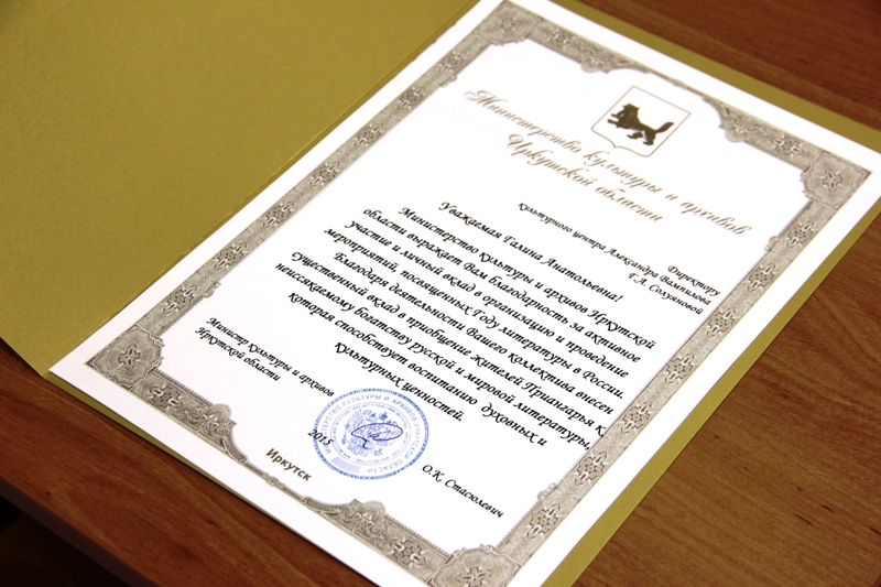 Министерство культуры и архивов Иркутской области выражает Вам благодарность за активное участие и личный вклад в организацию и проведение мероприятий, посвящённых Году литературы в России. Благодаря деятельности Вашего коллектива внесён существенный вклад в приобщение жителей Приангарья к неиссякаемому богатству русской и мировой литературы, которая способствует воспитанию духовных и культурных ценностей.
