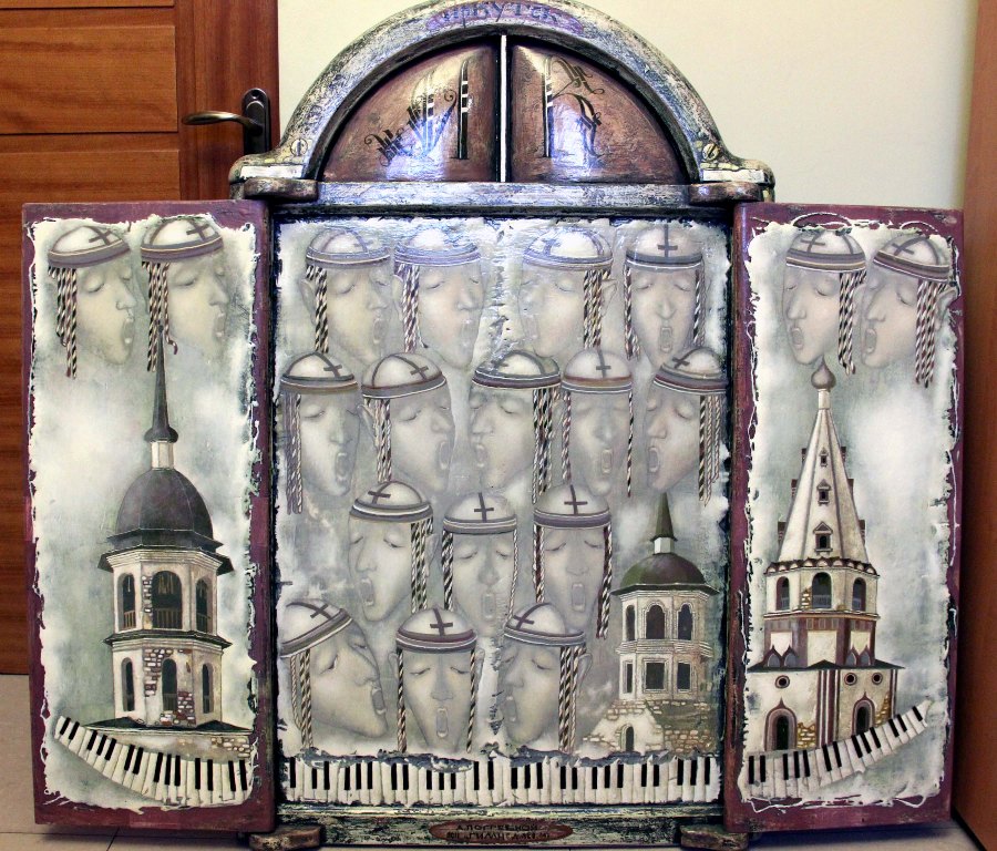Фотоотчет Анатолия Бызова. В Центр А.Вампилова поступил роскошный дар – это работа Анатолия Погребного, творчество которого до сих пор не было представлено в Картинной галерее. Даритель – иркутянка Ирина Назимова, которой мы бесконечно благодарны за великолепный подарок. Складень «Гимн» создан художником в 2011 году. Это необыкновенный триптих на церковный мотив, выполненный из дерева в виде окна со ставнями (маслом расписаны обе стороны ставен). «Иркутск» - выписано на верхней части окна, и ещё более знаменательным становится дар в год 355-летнего юбилея города. Приглашаем увидеть прекрасное! Анатолий Погребной. Справка. Художник родился в 1955 году недалеко от г. Усть-Илимска, где с 1989 года живёт и творит. В 1975 г. окончил Иркутское училище искусств. С 2007 г. преподает в филиале ИГПУ на кафедре изобразительного искусства. Действительный член Академии художеств России, с 1996 г. член Союза художников России. В том же году стал лауреатом премии губернатора Иркутской области в номинации «Изобразительное искусство» за достижения в сфере культуры и искусства. Является активным участником региональных, областных, зональных и всесоюзных выставок. Работы Анатолия Погребного, которые отличаются собственным узнаваемым стилем, техникой выполнения, находятся в музеях и частных коллекциях в России и за границей.