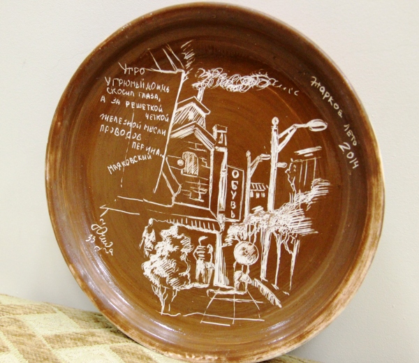 На керамической тарелочке, которую для Центра А.Вампилова нашла сотрудник музея «Абрамцево» Светлана Андреева, в интересной технике выполнен рисунок, напоминающий вампиловский образ городской улицы, где мог бы жить «Старший сын» Бусыгин и его приятель Сильва, встретиться Колесов и Таня из «Прощания в июне», прогуливаться персонажи из ранних рассказов. Новый экспонат займёт своё место в экспозиции коллекции тарелок.