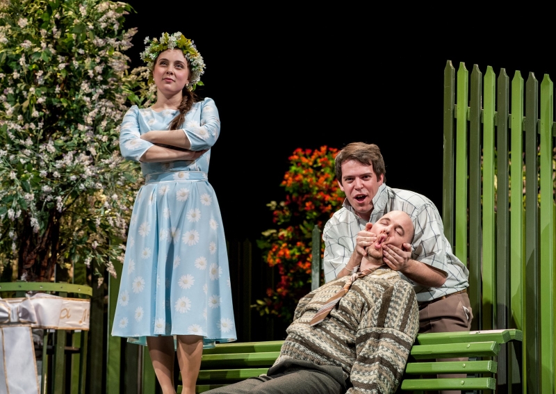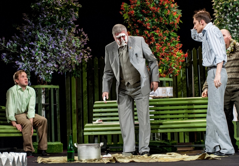 Фотоотчет Анатолия Бызова. Волонтёр Центра Сара Чатта подготовила для сайта Дома драматурга ещё один материал, над которым она работала долгое время: внимательно читала пьесу «Прощание в июне» и все ранние варианты, также научные комментарии и некоторые литературоведческие материалы, смотрела фильм, а главное, сходила на спектакль в Иркутский драматический театр, премьера которого прошла в марте, и поговорила с режиссёром Геннадием Гущиным. Что получилось - в нашей сегодняшней русско-английской публикации. Текст: Сара Чатта Фотографии Анатолия Бызова с сайта драматического театра им.Н.П.Охлопкого «Прощание в июне» Геннадия Гущина «Прощание в июне» Александра Вампилова сейчас идёт в театре им. Н.П.Охлопкова впервые более чем за сорок лет, режиссёр спектакля – Геннадий Гущин. Действие развивается в 1960-х годах, весной, в таком, как Иркутск, городе. События происходят на улицах с цветущими деревьями, в парках, в саду, где Колесов выращивает альпийскую траву, надеясь, что однажды она станет лугом. Спектакль начинается со сцены, в которой группа студентов под гитару исполняет песню: «Приходит время, люди голову теряют, и это время называется весна!». Но яркая и радостная окружающая обстановка часто противоречит тем событиям, когда юные герои сталкиваются с жестокими реалиями мира. Весна, как время действия, созвучно появлению молодёжи. Юность – красивая, но не всегда лёгкая пора. Главным героем является Колесов – скороспелый и озорной студент геологии в свой последний год в университете. Как мы знаем, ректор университета угрожает ему отчислением, дело доходит до сделки: Колесов должен перестать видеться с Таней, дочкой ректора, для того, чтобы получить диплом. Когда у меня была возможность встретиться с режиссёром «Прощания в июне» Геннадием Гущиным, мы обсудили основные конфликты пьесы, а также то, как его спектакль можно сравнить с оригинальным текстом пьесы и замыслами самого Вампилова. Геннадий Степанович впервые увидел «Прощание в июне», когда работал в иркутском драмтеатре в 1970-х годах. «Этот спектакль, – сказал Геннадий Гущин, – произвёл на меня сильное впечатление. Я испытал радость и предвосхищение добра: когда смотришь такой спектакль, понимаешь, что впереди у тебя обязательно будет всё хорошо. Тот спектакль давал надежду». Итак, на первом курсе Иркутского театрального училища Геннадий Гущин заболел пьесой Вампилова. Известно семь вариантов пьесы, и для своего спектакля режиссёр использовал весь этот материал, в том числе самый ранний вариант, который называется «Ярмарка»[1]. «Смысл ‘Ярмарки’ - первого варианта ‘Прощания в июне’– в том, что люди продают себя так же, как торгуют своим имуществом, в этой игре Колесова «продаёт» его диплом. Во время создания пьесы в стране была очень жёсткая цензура, и пропустить тему торговли дипломом в советском обществе было невозможно. Поэтому Вампилову рекомендовали изменить название, и он выбрал то, что известно нам сегодня». Гущин назвал пьесу «правовой комедией об отношениях между Колесовым и Таней», любовь которых постоянно испытывается материальными благами. И таким образом, мир «Прощания в июне» - это мир, в котором всё продается, если человек морально не против. Персонажем, который вводит эту тему в спектакль, является Зoлотуев. «Вообще фамилия Золотуев образуется от дву