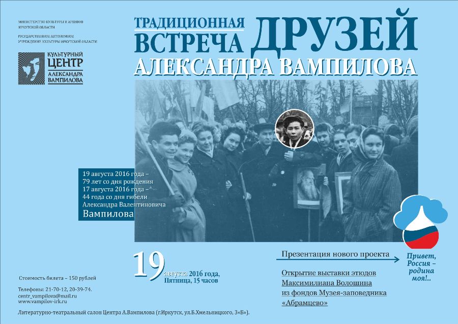 Фотоотчет Анатолия Бызова. Наступил месяц, в котором мы как всегда отмечаем две вампиловские даты - 79 лет со дня рождения драматурга 19 августа и 17 августа - 44 года со дня гибели. В Центре по заведённому некогда Фондом А.Вампилова обычаю состоится очередная Традиционная Встреча друзей Александра Вампилова, и пройдёт она 19 августа в 15 часов. В этот день мы презентуем новый проект, названный строкой Николая Рубцова «Привет, Россия - родина моя!..». Этот проект - выход Центра на общероссийский уровень культурного взаимодействия. И первым соучастником станет Музей-заповедник «Абрамцево», расположенный в 60 км от Москвы, и хранящий бесценные экспонаты: на территории музея почти в 50 га расположены памятники архитектуры XVIII и XIX вв., парк и живописные окрестности, где создавали свои произведения выдающиеся русские художники, где жили и гостили классики русской литературы. С Абрамцево Дом драматурга связывают тёплые дружеские отношения. Новый проект откроется выставкой пяти работ Максимилиана Волошина, копии которых были сделаны в Абрамцево и предоставлены для экспозиции в Иркутске. Впервые наш город увидит этюды этого самобытного поэта Серебряного века, который известен также и как пейзажист. А как связан Вампилов и Волошин? Мы обязательно найдём ответ на этот вопрос, потому что знаем - ни одно имя случайно в Доме драматурга не звучит... Помимо увлекательного исследовательского поиска и открытия выставки в программе Традиционной Встречи - стихи Максимилиана Волошина и более подробное знакомство с жизнью Музея-заповедника «Абрамцево».