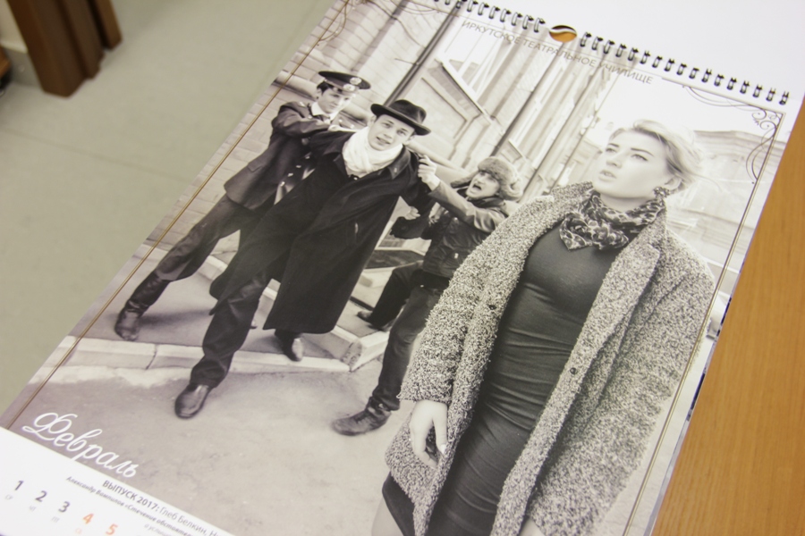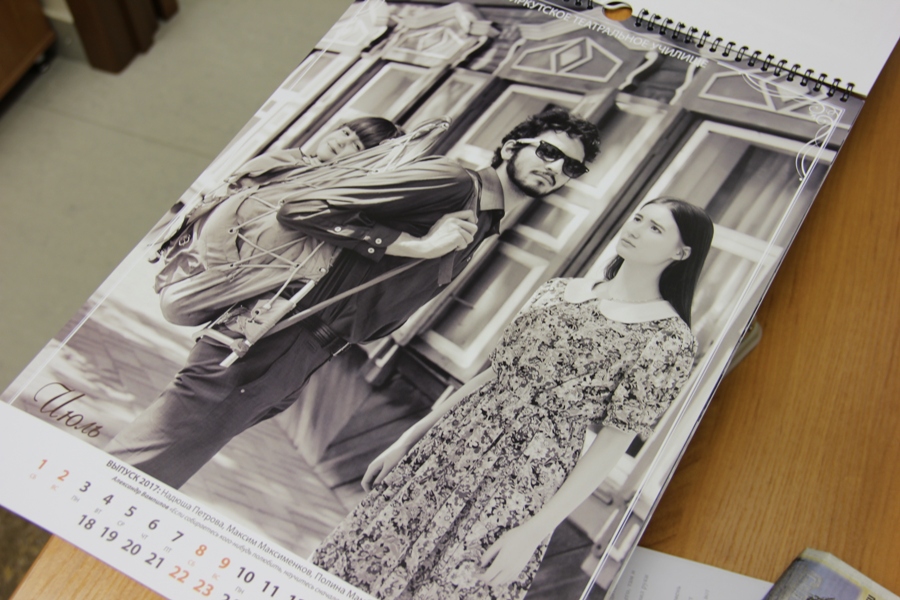 Фотоотчет Анатолия Бызова. По традиции выпускной курс Иркутского театрального училища и фотограф Марина Свинина готовят к Новому году календарь с фотографиями студентов. Сюжеты бывают разные, и в этот раз календарь 2017 года посвящён Александру Вампилову. Подготовку к выпуску календаря фотограф и студенты начали ещё в мае, когда цвела сирень, чтобы сделать, например, снимок в парке и воспроизвести сцену из первого вампиловского рассказа «Финский нож и персидская сирень». Каждая страница отображает сцену из того или иного произведения Вампилова, и листать его одно удовольствие, особенно тем, кто хорошо знаком с творчеством драматурга: при первом взгляде на фотографию угадывается, откуда именно заимствован сюжет. Есть здесь и воспроизведение известных вампиловских фотографий. В этом календаре совпало всё: и удачное оформление, и прекрасные снимки, и сопровождение каждой страницы цитатами Вампилова, и, конечно, видимое со страниц душевное и почтительное отношение к Александру Вампилову. Поздравляем наших друзей с великолепно выполненной работой! Календарь посвящен не только 80-летию Александра Вампилова, но и 55-летию театрального училища, которое Иркутск отметит в наступающем году.