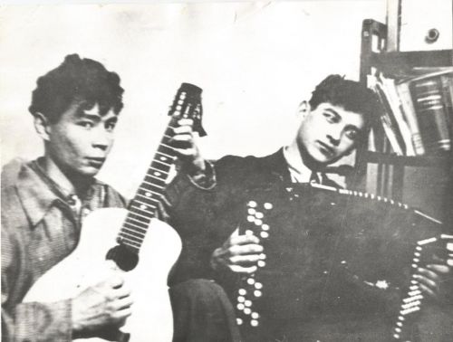 Фотоотчет Анатолия Бызова. Многие из знавших Вампилова связывают его студенческий облик именно с гитарой, а на фотографиях он запечатлен с нею в руках. Это не случайно. Обычно сдержанный, немногословный, особенно в случайных компаниях, умеющий короткой фразой, репликой или просто легкой иронической улыбкой сказать гораздо больше своих разговорчивых собеседников, он внутренне и внешне изменялся, когда брал в руки гитару. Преображался, когда машинально перебирал струны легким касанием пальцев, пробуя аккорды и искусно извлекая флатолеты, питая к ним слабость. В какой-то момент появлялась музыкальная тема… Игорь Петров, одногруппник Александра Вампилова