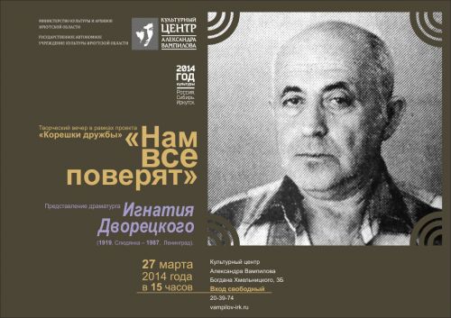 Фотоотчет Анатолия Бызова. 27 марта во всём мире люди Театра отмечают свой профессиональный день. Культурный центр Александра Вампилова вот уже в третий раз приобщается к этому празднику: в 2012 году мы открывали фотовыставку Анатолия Бызова «Загадочные лики Иркутска», в 2013 представляли актёра ТЮЗа им.А.Вампилова, заслуженного работника культуры РБ Владимира Безродных. На сей раз мы попробуем взглянуть на театр немного под другим углом – со стороны профессии Драматурга. Имя Игнатия Дворецкого (1919–1987), к сожалению, в наших краях малоизвестно, хотя малая родина его здесь, у байкальского берега. Он уехал в Ленинград уже после окончания историко-филологического факультета Иркутского госуниверситета, а родился Игнатий Моисеевич в Слюдянке. Автора пьес «Человек со стороны», «Мужчина семнадцати лет», «Трасса», «Колыма» в 60-80 годах прошлого века знал каждый театральный любитель. Пьесы драматурга были поставлены во многих ведущих театрах страны, в том числе, в Театре на Малой Бронной: Анатолий Эфрос поставил «Человека со стороны» (1971), «Веранду в лесу» (1978) и «Директора театра» (1984). По пьесе «Человек со стороны» в 1973 году был снят фильм «Здесь наш дом» (реж. Виктор Соколов) с Владимиром Заманским, Ириной Мирошниченко и Арменом Джигарханяном. Монолог главного героя произведения прозвучит и на нашем вечере. Таким образом, в Центре Вампилова в День театра произойдёт увлекательное драматургическое действо с познавательным краеведческим оттенком.
