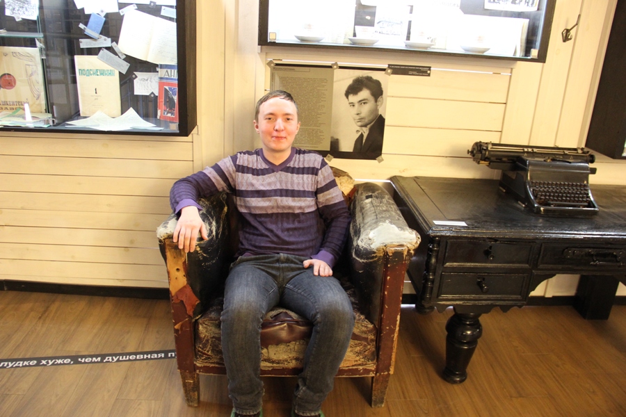Фотоотчет Анатолия Бызова. «Стечение обстоятельств» привело меня в Иркутск, и я не мог не посетить Центр Александра Вампилова». С таких слов началось общение со вчерашним гостем – Алексеем Загребиным, актёром московского театра-студии «Постскриптум». Хотя часть театральной труппы - любители, но репертуар, к которому они обращаются, очень серьёзный. Недавно прошла премьера спектакля «Старший сын» Александра Вампилова, а теперь готовится постановка «Утиной охоты». Нашему посетителю предстоит играть роль Кушака и он, попав в наш город, захотел наиболее полно познакомиться с судьбой Александра Вампилова, почувствовать, каким он был человеком, чтобы лучше понять своего персонажа. Алексей побывал у Камня-символа, а после этого заехал в Дом драматурга: поговорил о будущем спектакле за кружечкой чая, посетил Картинную галерею и экспозицию «На антресолях». Мы всегда искренне радуемся, когда к нам приходят люди, действительно увлечённые творчеством драматурга! Надеемся, посещение Центра подарило Алексею вдохновение, которое выльется в блестящее воплощение на сцене.