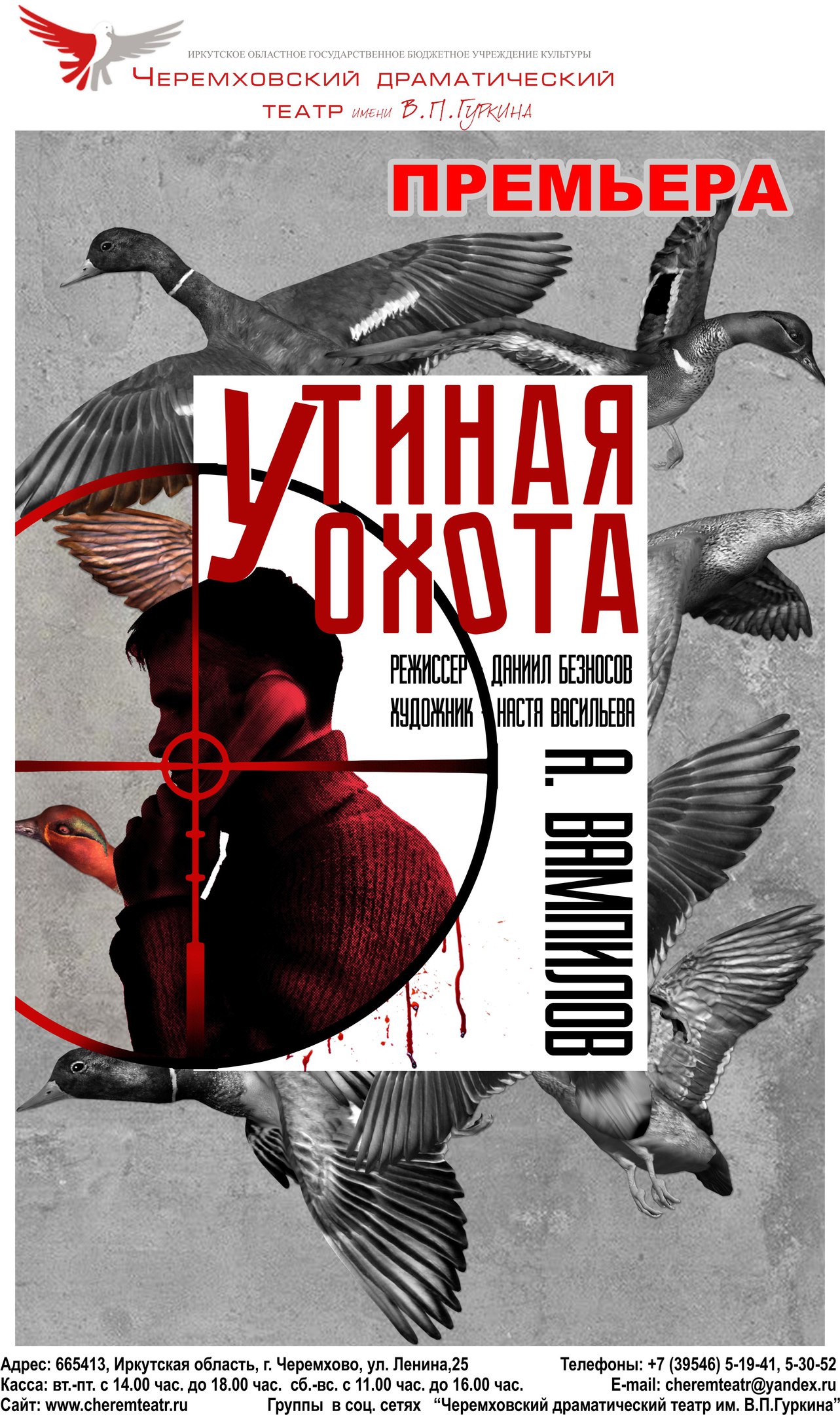 Фотоотчет Анатолия Бызова. В Иркутск с гастролями приехал Черемховский драматический театр имени В.П. Гуркина. На сцене ТЮЗа им. А.Вампилова со 2 по 7 апреля труппа театра представляет 5 спектаклей. Гастроли открылись пьесой Александра Вампилова «Утиная охота» в постановке главного режиссёра Краснодарского молодёжного театра Даниила Безносова. В спектакле заняты артисты: Артём Довгополый, Алексей Рычков, Олег Силантьев, Сергей Качурин, Василий Кулаженков, Алёна Беляевская, Анна Берлова и другие. Черемховский театр представляет пьесу следующим образом: «Пьеса «Утиная охота» одна из самых важных в понимании творчества автора. Эта пьеса дала такое новое русское явление, как «зиловщина». Что это за явление, и что это за герой Зилов? Человек, у которого внешне все складывается благополучно: семья, любящая жена, работа, достаток. Только почему то для него всё это не имеет ценности, лишено смысла. Почему то «нормальная жизнь» для него становится удушающей и нестерпимой и, он отчаянно разрушает жизни любящих его людей? Использованы материалы сайтов: https://vk.com/club77128185 и http://www.tuzvampilov.ru.
