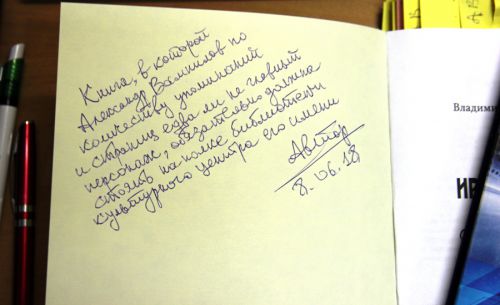 Фотоотчет Анатолия Бызова. Вчера библиотека Центра пополнилась новой замечательной книгой - «Иркутские страницы. О других и о себе». Подарил её автор - Владимир Ходий, журналист с более чем 50-летним стажем работы. «Книгу можно отнести к жанру воспоминаний. Но в отличие от классических мемуаров они представлены отдельными очерками и репортажами-исследованиями, эссе и интервью о событиях, в круговороте которых автор часто сам находился, и о людях, с которыми, так или иначе, соприкасался. В книге ничего нет вымышленного, это литература факта – литература, идущая к читателю рука об руку с жизнью». Владимир Васильевич оставил дарственную надпись: «Книга, в которой Александр Вампилов по количеству упоминаний и страниц едва ли не главный персонаж, обязательно должна стоять на полке библиотеки Культурного центра его имени». Несомненно, этот подарок не только интересный, но и очень ценный для Дома драматурга. Поклонники и исследователи творчества Александра Валентиновича смогут найти для себя много интересного в «Иркутских страницах» в Читальном зале Центра! Ждём вас!