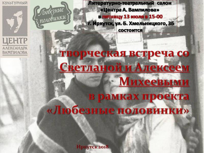 Фотоотчет Анатолия Бызова. Дорогие друзья! Приглашаем вас завтра, 13 июля, в 15-00 в Литературно-театральный салон Культурного центра Александра Вампилова на творческую встречу с семьёй Михеевых в рамках проекта «Любезные половинки»! Вечер будет наполнен поэзией, музыкой и интересными историями из жизни творческой семьи! С нетерпением ждём вас!