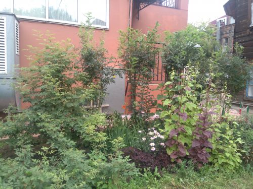 Сотрудники и посетители Центра А.Вампилова, подходя к лестнице, ведущей на 1-й этаж, где расположены Литературно-театральный салон и музейная экспозиция «На антресолях…», слева видят подстриженные акации и куст шиповника, в обрамлении «палисадника» из цветов. Обязательно останавливаются, потому как не заметить эту КРАСОТУ невозможно…
