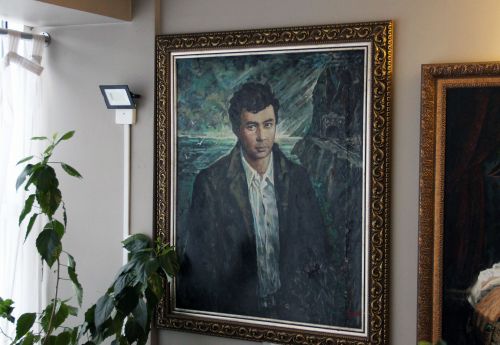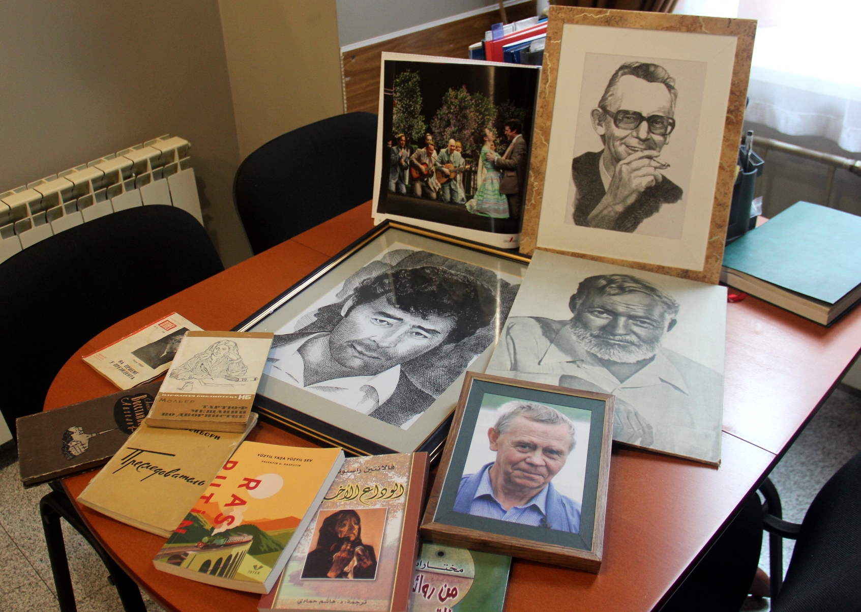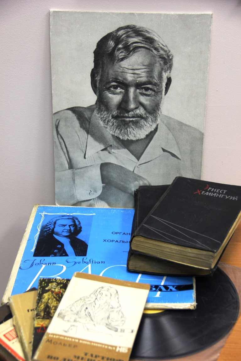 Портрет Хемингуэя, пластинки и книги