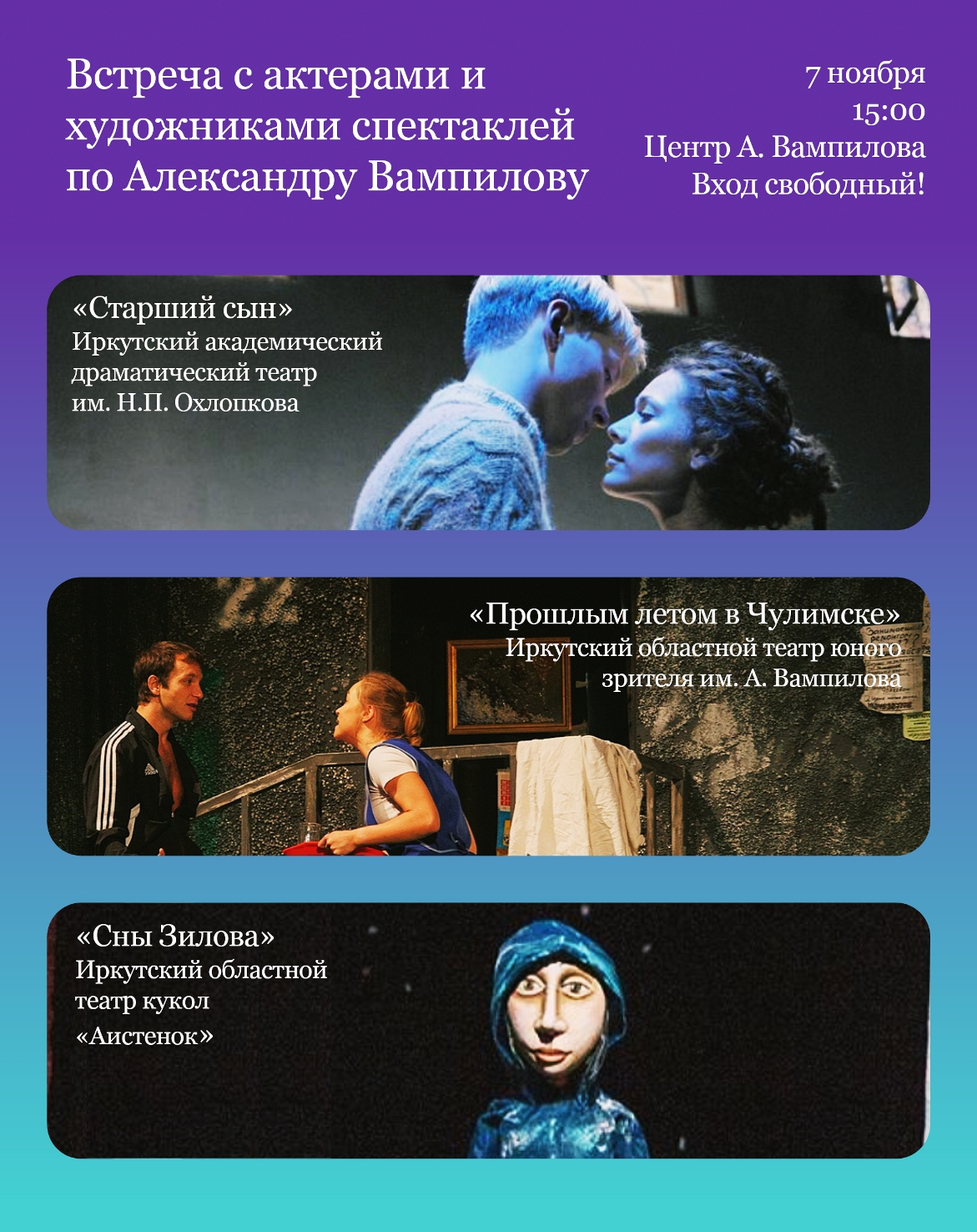 Весь апрель: К премьере оперы «Старший сын»: совместный проект Иркутского областного музыкального театра им. Н.М.Загурского и Центра А.Вампилова для молодежи (по программе «Пушкинская карта»)